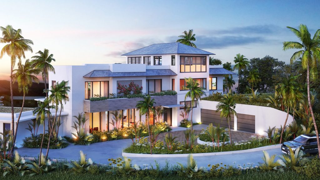 Situated in the northernmost point of the island of St. Lucia, this luxury residence is settled in the exclusive Mount Du Cap estate; a private, gated 38-acre development, located at one the ends of the island with views of the Caribbean Sea and St. Lucia’s northern neighbor Martinique. The entrance of the main house looks directly through the living room that seems to float over a massive infinity swimming pool in the background.